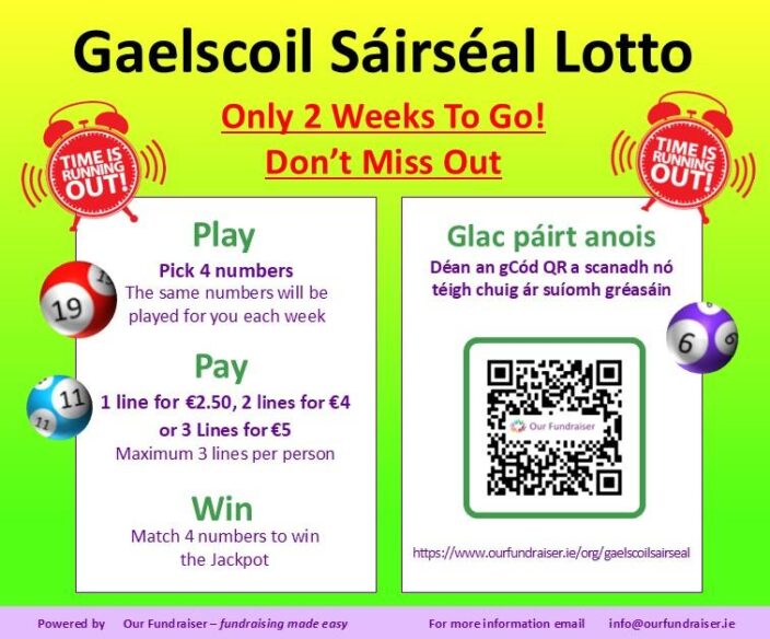 A chairde, Níl ach coicís fágtha anois don chéad lató! Úsáid an cód QR chun páirt a ghlacadh. Only two weeks to go until our first lotto draw! Use the QR code on the picture to join.
